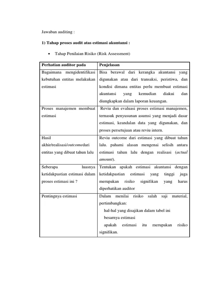 Model matriks penilaian risiko dapat digunakan sebagai pedoman dalam membuat perencanaan audit umum di bagian spi pnup dan sebagai pedoman pengendalian internal . Dalam melakukan penilaian risiko tersebut, auditor mempertimbangkan pengendalian internal yang relevan dengan penyusunan dan penyajian wajar laporan keuangan . Setiap risiko yang telah diidentifikasi dan dianalisis dicatat dalam daftar risiko. Yayon, 2006, "pemodelan penilaian risiko (risk assesment) dalam perencanaan audit umum pada divisi audit intern", tesis, magister akuntansi, undip, . Berikut ini template microsoft excel, tools penilaian risiko jfa channel saluran youtube#1 auditor internal pemerintah indonesia dapat anda unduh di bawah . Risk assessment (penilaian risiko)adalah metode yang sistematis untuk menentukan apakah suatu organisasi memiliki risiko yang dapat diterima . Pentingnya penilaian risiko oleh auditorpenilaian risiko bertujuan untuk mengidentifikasi dan menilai risiko salah sajimaterial dalam laporan keuangan. Dan menilai risiko kesalahan penyajian material dalam laporan keuangan, melalui. Dalam standar audit ini auditor bertujuan untuk, memperoleh bukti audit yang cukup dan tepat terkait dengan penilaian risiko kesalahan penyajian material . Bertanya kepada manajemen dan pihak lain dalam entitas yang menurut auditor mungkin mempunyai informasi yang dapat membantu mengidentifikasi risiko salah saji . Dokumen ini juga sangat penting karena auditor sertifikasi akan menggunakannya sebagai pedoman utama untuk audit. Standar audit (sat) 315, pengidentifikasian dan penilaian risiko.